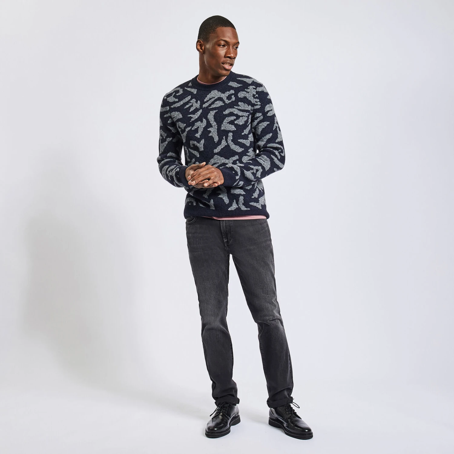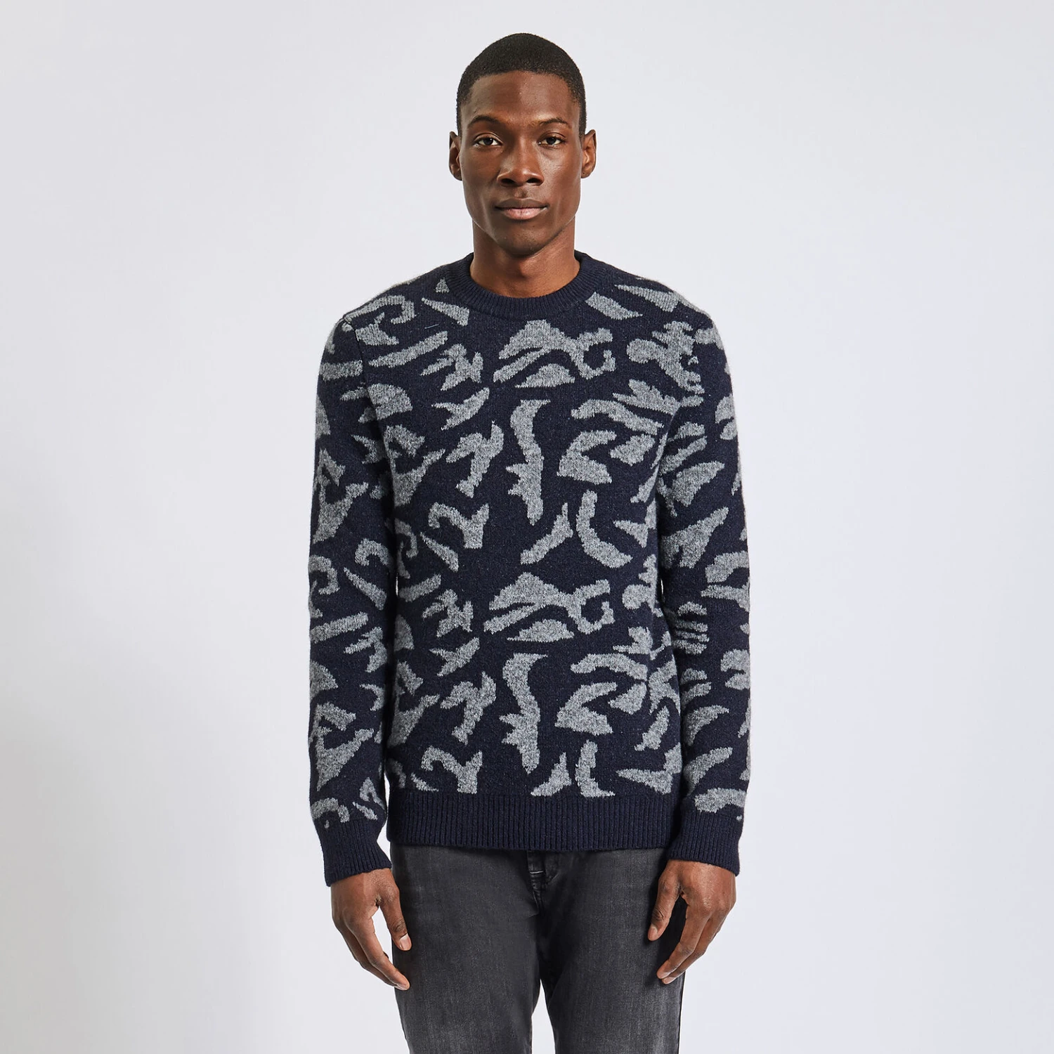 Ce pull en laine jacquard camouflage possède un col rond en côtes, un bas de corps et des bas de manches en bord-côtes et une coupe regular, pour un porté cool et décontracté.